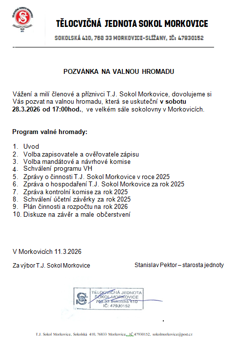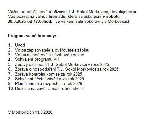 dovolujeme si Vás pozvat na valnou hromadu, která se uskuteční v sobotu 28. března 2026 od 17:00 hodin ve velkém sále sokolovny v Morkovicích.